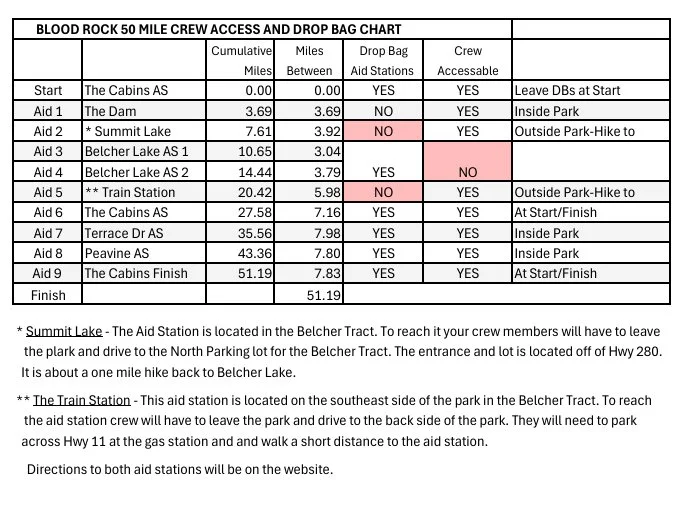 The Summit Lake and Train Station aid stations can only be reached by leaving the park. Overnight crew members can only go to either aid station through the front, south gate, near I-65 over night. The north gate closes at 5:00 PM and does not reopen until 7:00 AM. (You must also return to the park through the south gate.) To get into the park overnight, you must have reserved lodging in the park or have the Blood Rock Crew Car Pass. Without one or both, you cannot get back into the park at night.