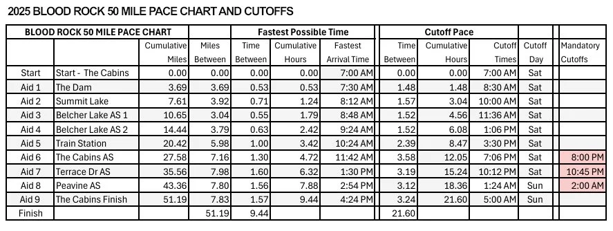 Due to the extremely difficult and remote nature of the backcountry sections of Blood Rock, we must enforce mandatory cutoffs.